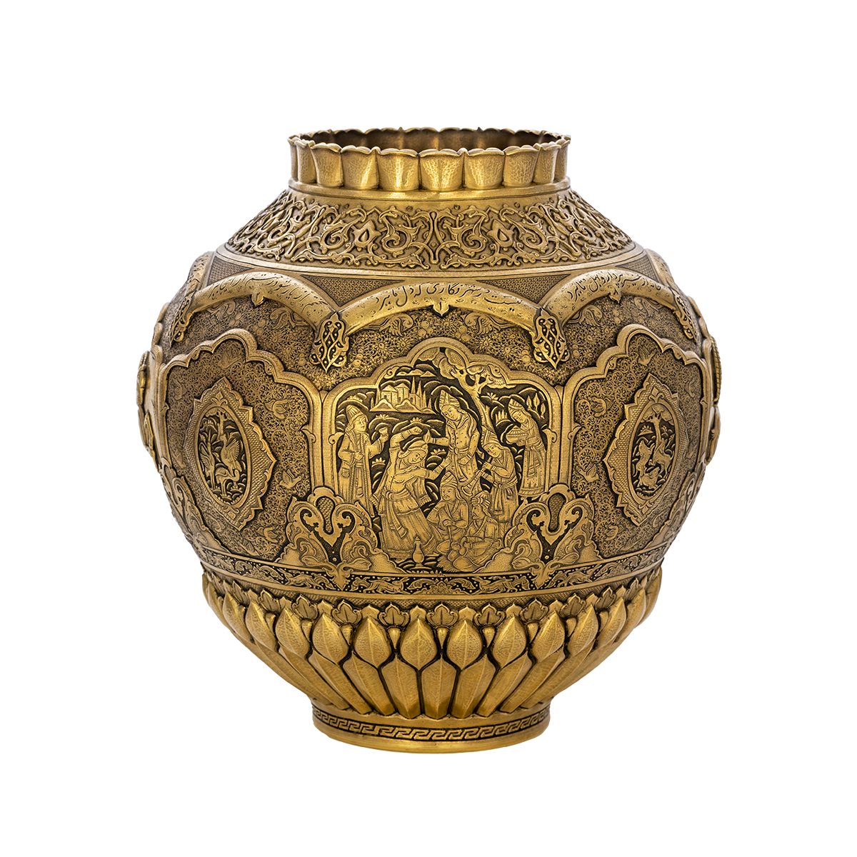 In its central section, the festive motifs of the Safavid period intertwine with Sassanian rams, creating a dialogue between two ages of Iranian beauty and symbolism. Along the upper rim, arabesque patterns emerge in delicate relief, while below, rhythmic and repeating sunbursts form a captivating visual harmony.