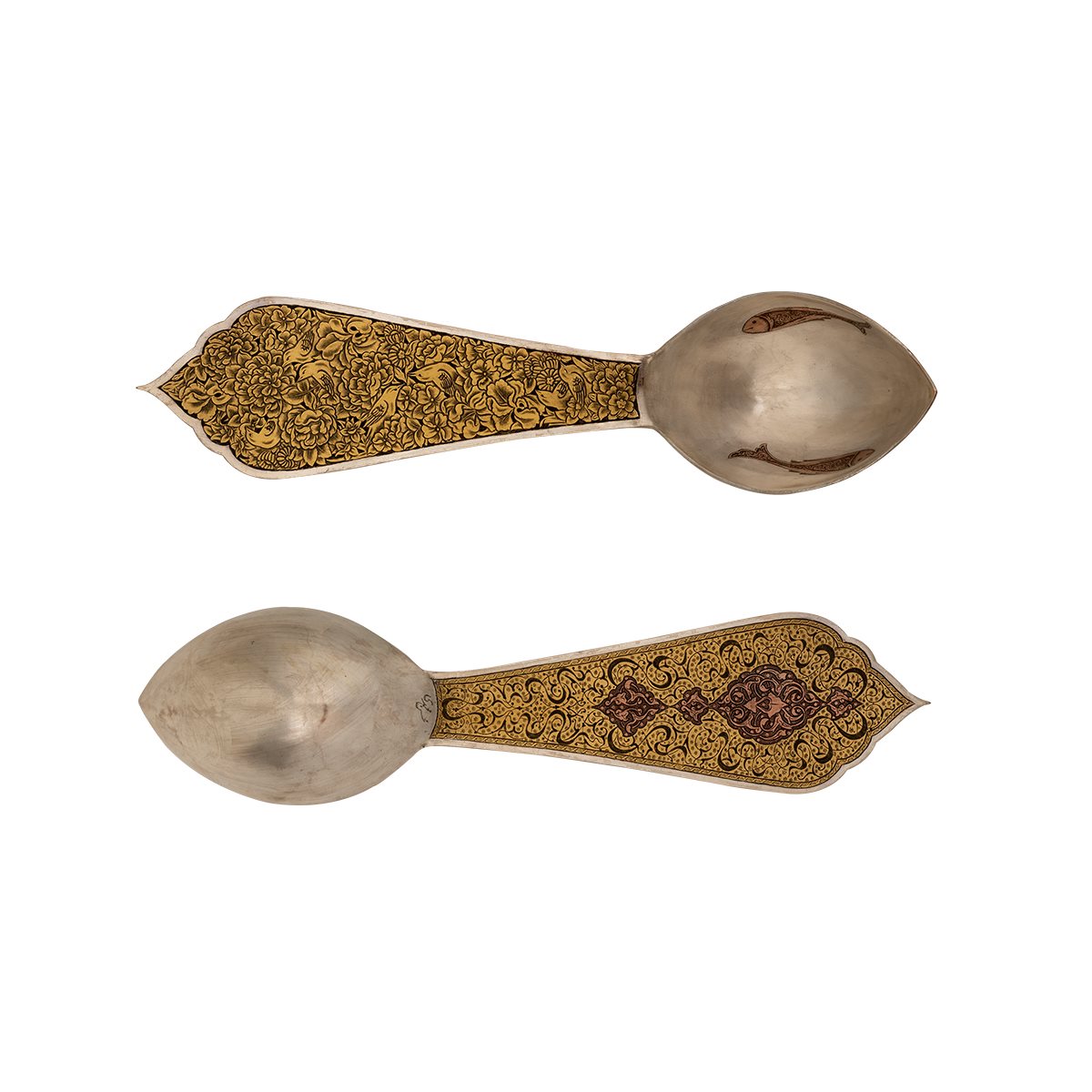 On the handle of the ladle, golden and rose-hued birds soar toward their eternal and divine love—a bridge between the material realm and the spiritual one.