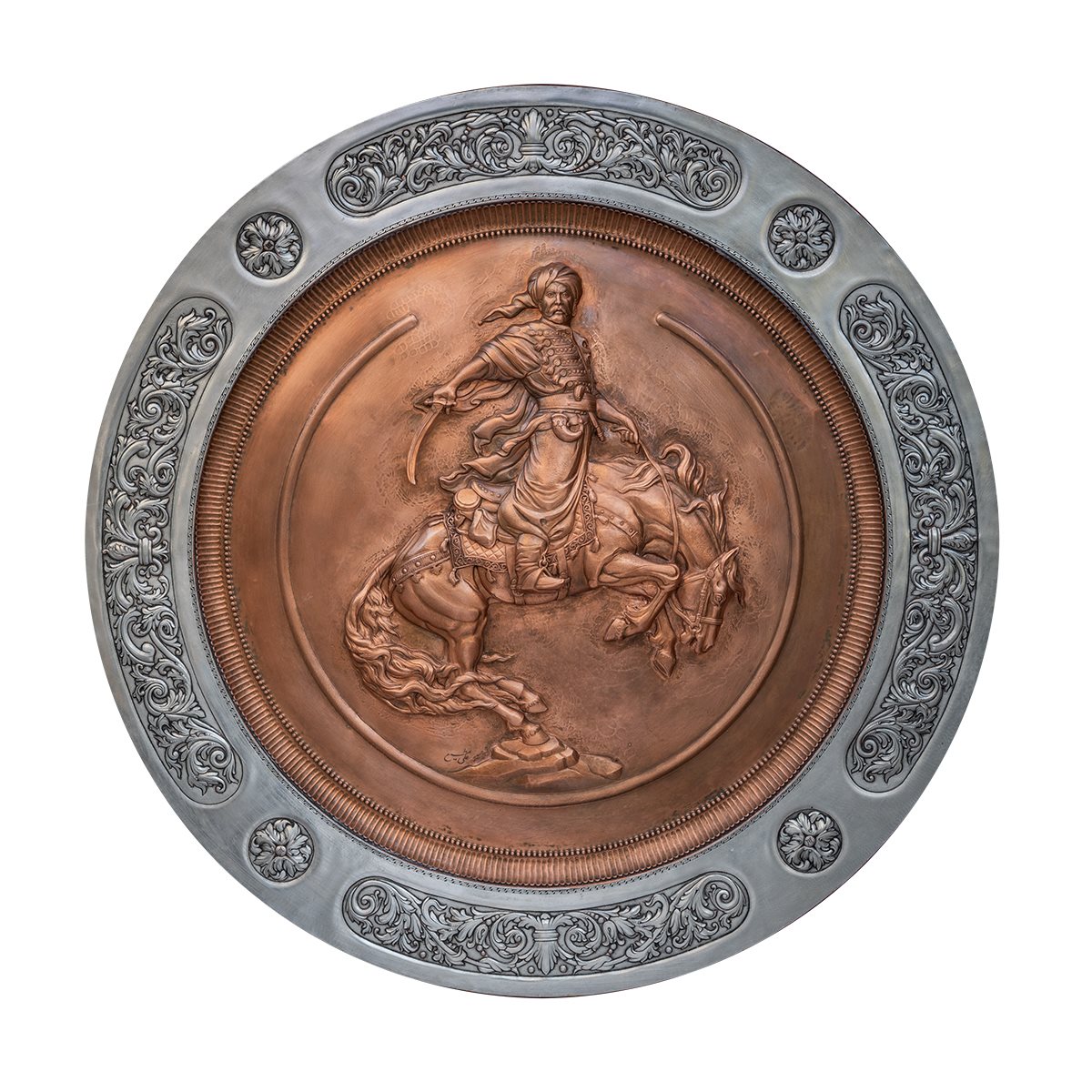 This 66-centimeter-wide panel is a striking and technically demanding piece; at such scale, once the metal is tar-backed, its substantial weight makes the engraving process considerably more challenging.